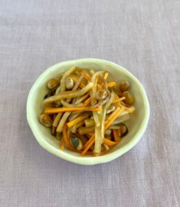名前の由来は「わからないけれど、栄養たっぷりってことかな」と臼井さん。大根、にんじん、昆布、スルメと、よく炒った大豆を、醤油、酢、砂糖の漬け汁に一晩漬けて完成。大豆のポリポリ食感と香ばしい味がたまりません。