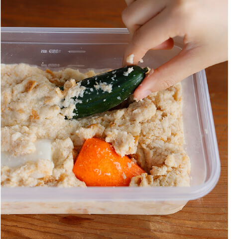 「パン床」は、パンとビールの酵母の香りで風味をつけます。酵母が生きているビールを使うと発酵し、ぬか漬けに似た風味に。米ぬかが手に入りにくい、海外に暮らす日本人が始めたといわれています。