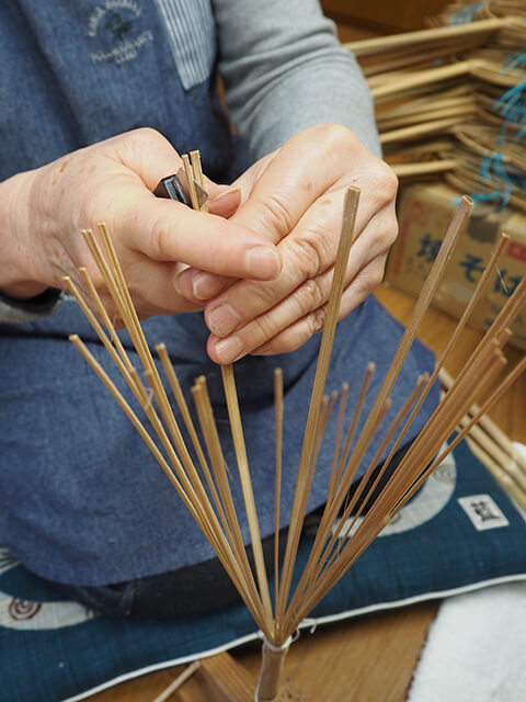 「大事なのは割きやすい竹を手に入れること。きれいに割ければ、編みも紙を張るのもうまくできます。割きでは親指のつけ根、とくに左手に力がいるんですよ」と両手を見せてくれた。親指の関節がぼこっと張り出ていて、素人が見ても長年技を磨いてきた人の手だと伝わってくる。説得力のある手でとてもかっこいい。